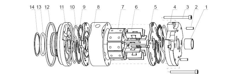 2.To adopt floating structure for side plate,it will do a compensation for end-face clearance by automatic,so that even the pumpunder high pressure it can maintain a high volumetric efficiency.